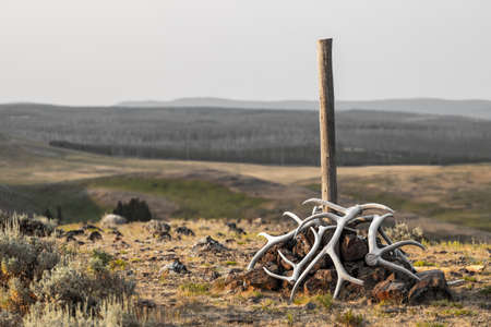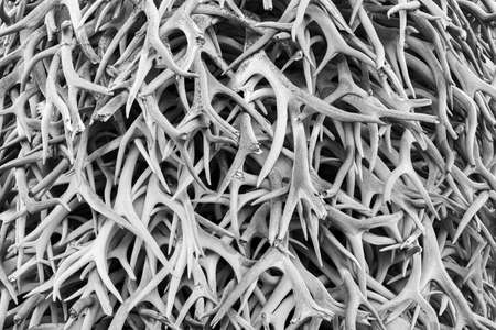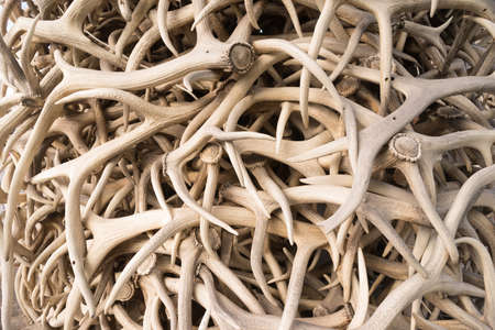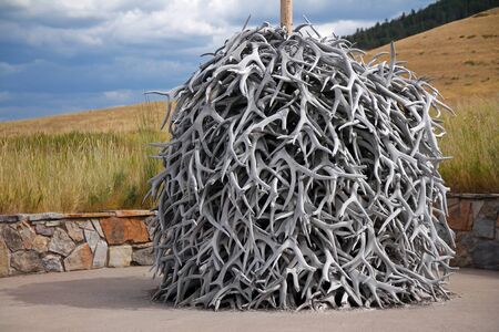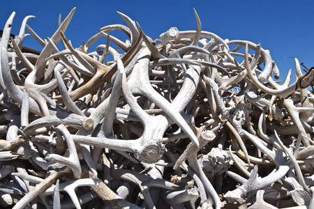 Huge stacked pile of deer or elk antlers at National Bison Range wildlife refuge, Montana, USA