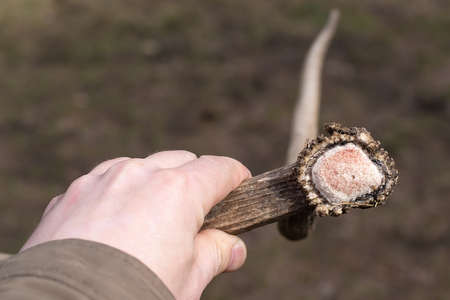 A deer antler with a brown tip. The antler is curved and has a brown tip