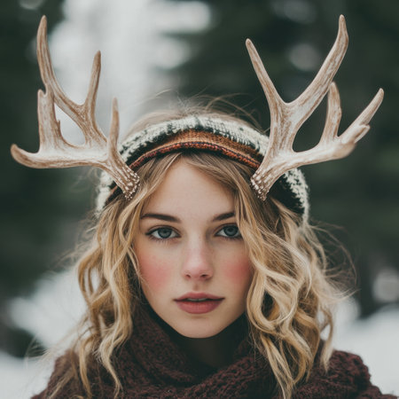 In a serene winter landscape, a young woman showcases her unique style with an antler headband perched atop her wavy, golden locks. The cool air glistens with soft snowflakes, adding a magical touch to her surroundings. A warm, knitted scarf wraps around her neck, offering comfort against the chill. Framed by tall, majestic trees draped in white, she gazes into the distance, embodying a blend of nature and fashion in this enchanting moment.