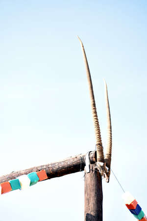 A vertical shot of animal horns attached to a wooden frame with a clear sky in the background