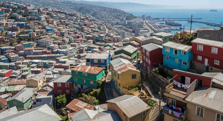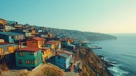 Explore a vibrant coastal community featuring colorful wooden houses perched on a hillside overlooking the shimmering ocean, reflecting the charm of seaside living in Chile.
