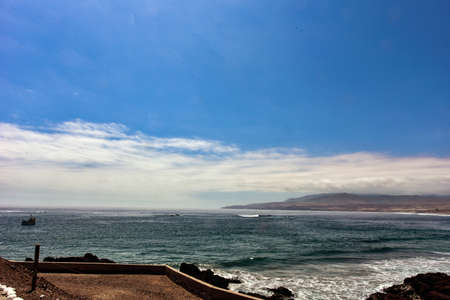 fishing village at the coastline of Peru, a place were desert meets the ocean. Showing blue sky, clouds and a sandy desert beach, fishing huts and boats