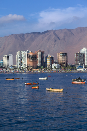 IQUIQUE, CHILE - JANUARY 23, 2015: View from the peninsula at the end of Cavancha beach over the fishing boats anchoring in the bay, Cavancha beach and the modern tall buildings along Arturo Prat Chacon Avenue on January 23, 2015 in Iquique, Chile. Iquiqu