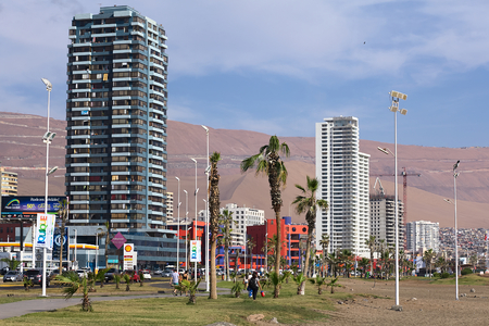 Antofagasta, Region de Antofagasta, Chile - April 19, 2017: Skyline of buildings and people at the boulevard at the side of the beach.