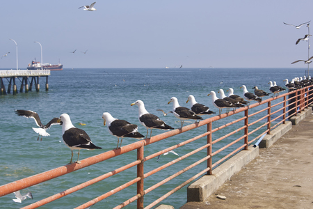 Seagulls lining the railings of a pier at the fish market port city of Valparaiso in Chile.