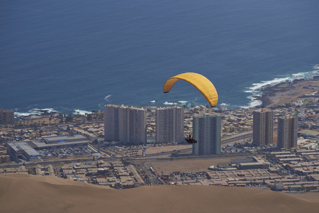 Iquique, Tarapaca Region, Chile - August 20, 2017: Paraglider over the coastal city of Iquique on the northern coast of Chile.