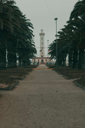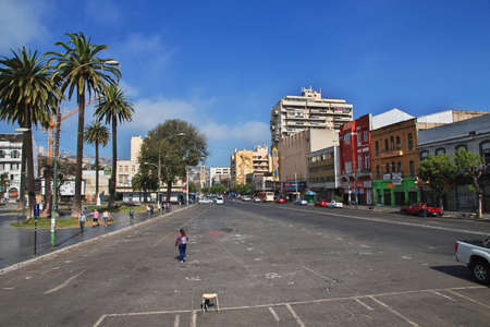 IQUIQUE, CHILE - JANUARY 23, 2015: Unidentified people walking along Arturo Prat Chacon avenue along the beach on January 23, 2015 in Iquique, Chile. Iquique is a popular beach town and free port city in Northern Chile. The red-blue building is the Arturo