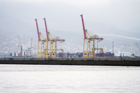 Russia, Novorossiysk, April 11, 2021: A cargo port pier with portal cranes and a cluster of containers. In the background, the city is in fog. It's drizzling rain.