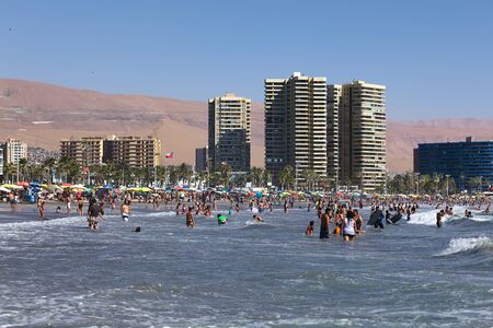 IQUIQUE, CHILE - FEBRUARY 10, 2015: Unidentified people bathing in the Pacific ocean at Cavancha beach on February 10, 2015 in Iquique, Chile. Iquique is a popular beach town and free port city in Northern Chile.