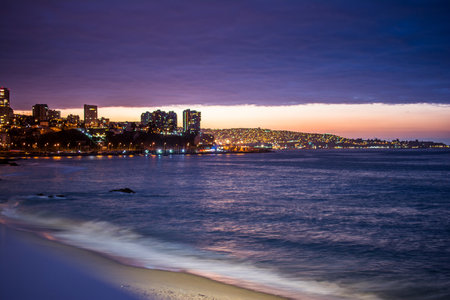 A beautiful view of a beach surrounded by illuminated building in Vina del Mar, Chile
