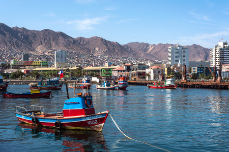 Antofagasta, Chile - April 5, 2015: Colourful wooden fishing boats in the harbour at Antofagasta in the Atacama Region of Chile