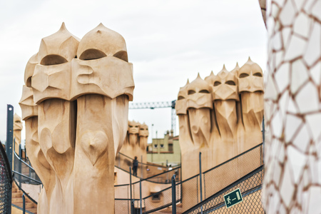BARCELONA, SPAIN ? APR 14: Chimneys like masked soldiers on the roof of La Pedrera or Casa Mila designed by Antoni Gaudi, on April 14, 2012 in Barcelona, Spain. La Pedrera was built in 1906-1910.