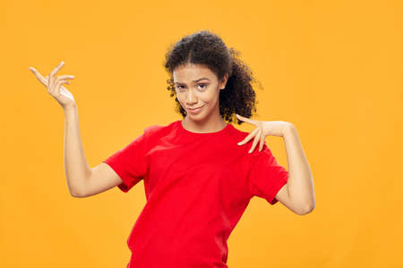 portrait of a young woman in an orange sweater in blue caps hand gesture isolated backgrounds unaltered