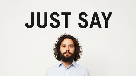 A man with curly hair and a beard stands beneath the text 'JUST SAY' against a plain white background. The composition features a clean, simple style with focused lighting. This image could be used in various commercial or editorial projects related to communication and messaging.
