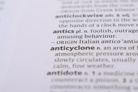 Close Up Of English Dictionary Page With Word - anticyclone