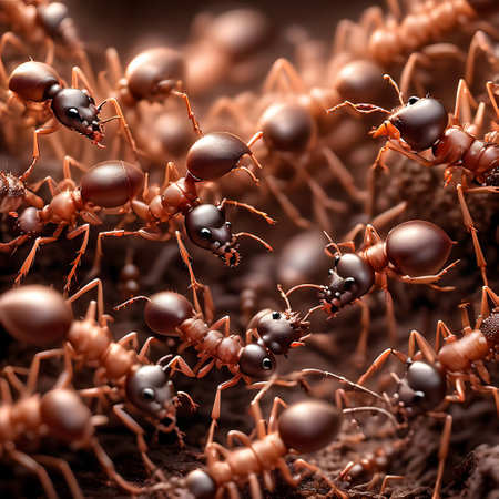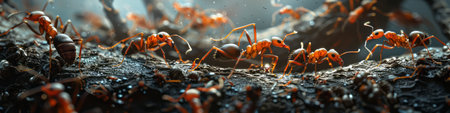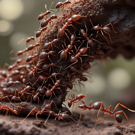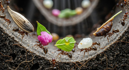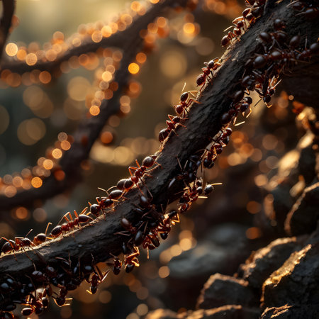Discover the fascinating world of ants captured in a stunning close-up, highlighting their social behaviors and intricate interactions within their natural habitat.