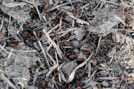 A captivating close-up of a colony of red ants busily surrounding their nest. This image showcases their intricate behavior and teamwork within the natural environment.