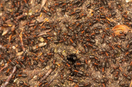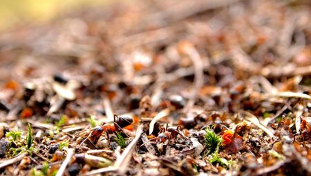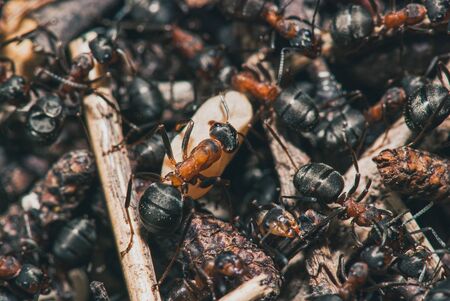 forest ants team carry out their work in an anthill. A perfect example of teamwork. Selective focus macro shot with shallow DOF