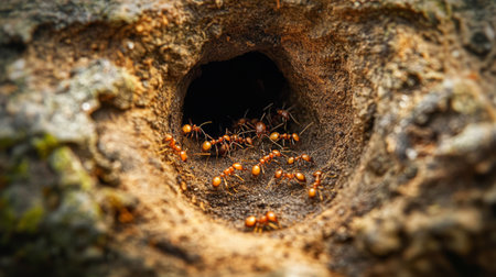A captivating close-up image of ants actively entering their nest hole in the ground, showcasing the intricate behavior of these diligent insects in their natural habitat.