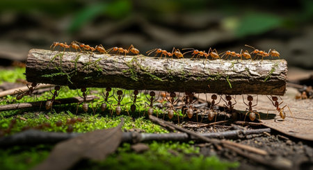 A macro shot of industrious ants working together to transport food across a forest floor, showcasing teamwork and efficiency in nature.