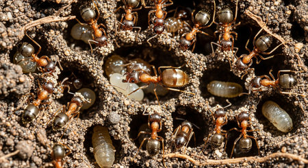 A colony of ants constructing an intricate network of tunnels and chambers in their underground nest, showcasing their architectural skills.