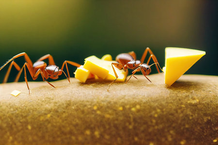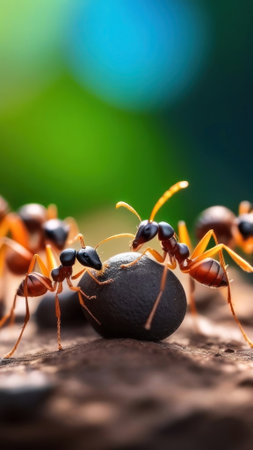 A captivating close-up of ants working together over a pebble, showing their incredible teamwork and strength. The vibrant background highlights their detailed textures. Generated AI.