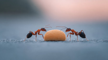 Two ants work together to collect food on a surface, capturing the essence of teamwork in nature under a beautiful sunset backdrop filled with soft colors.