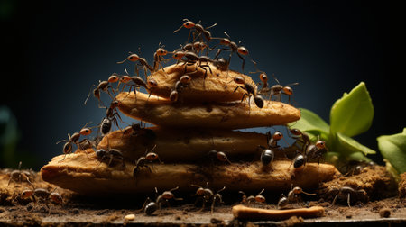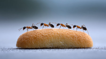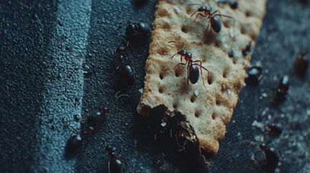 An intimate look at ants foraging on a piece of snack bread, showcasing their intricate teamwork and connection to the environment in vivid detail.