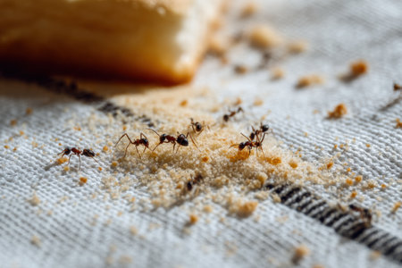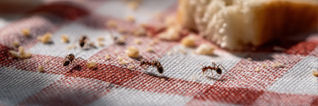 Ants form a busy trail on a picnic cloth, gathering tiny food crumbs left over from a meal outdoors in warm weather, showcasing natures scavengers.