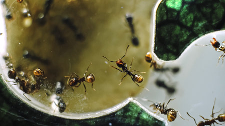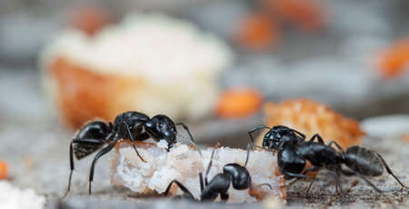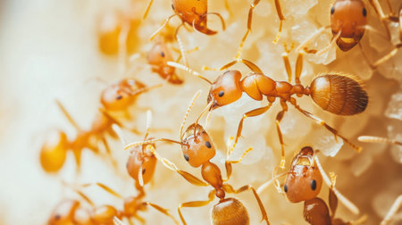 Macro photo of ants. Ants eating sugar close up. insect macro photography.