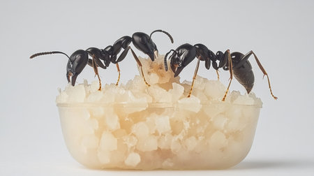 This image showcases a close-up view of black ants actively feeding on sugar crystals. The ants emerge from a transparent container, highlighting their intricate anatomy and social behavior while foraging for food.