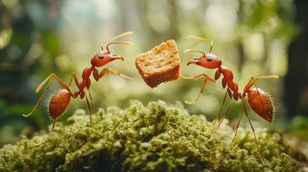 Two red ants work together to transport a piece of food in a vibrant green forest. The image captures the intricate details of their teamwork and the lush environment.
