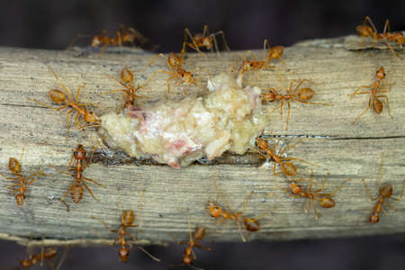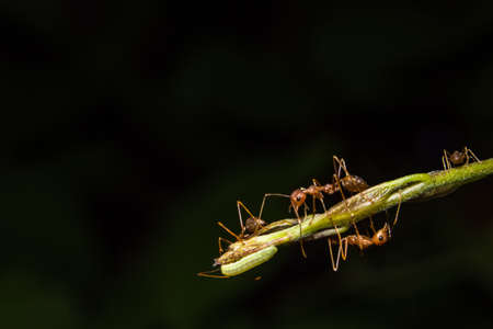 Close up of red weaver ants, teamwork or red weaver ants rip apart their prey