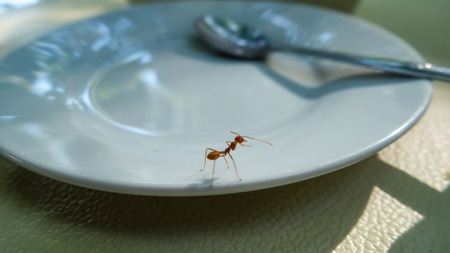 A big red ant exploring the empty dish in a restaurant