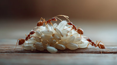 A captivating close-up image of ants gathering rice grains on a wooden surface. Soft lighting enhances the intricate details of the insects and their environment, highlighting their teamwork and natural behaviors.