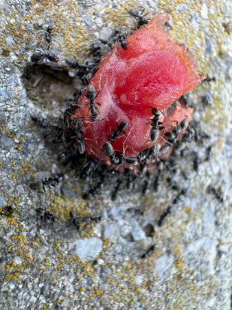 Ants and watermelon on the ground, close-up.