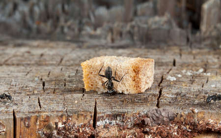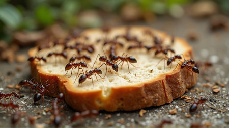 Infestation alert ants swarming over bread slice outdoors searching for food in natural environment