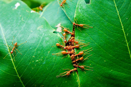 Red Ant bridge unity team. Close up Macro of Ant making unity bridge on plant with nature forest green background. Ant action standing.