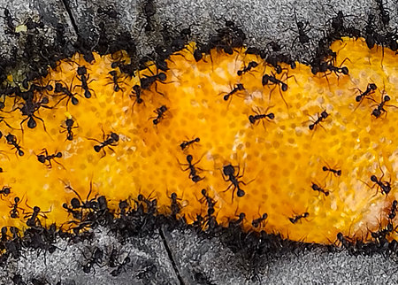 A swarm of fire ants devouring a fallen fruit, scavenging for food in the wild