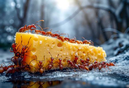 This is an artistic and surreal image depicting a large piece of cheese with holes which resembles a slice of Swiss cheese being eaten by a large number of ants