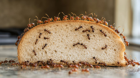 Close-up of ants covering a piece of bread in a kitchen, an unsettling image that calls attention to the risks of improper food handling.