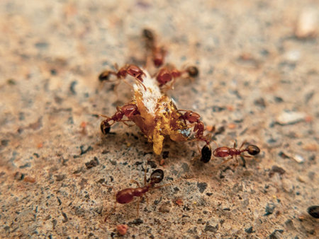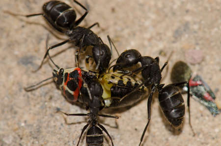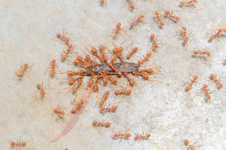 Big red ants team is struggling to draw dead prey or bait back to their nest for food storage.