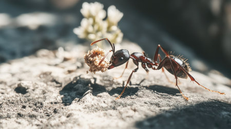 Macro view of determined ant carrying seed showcasing detailed exoskeleton