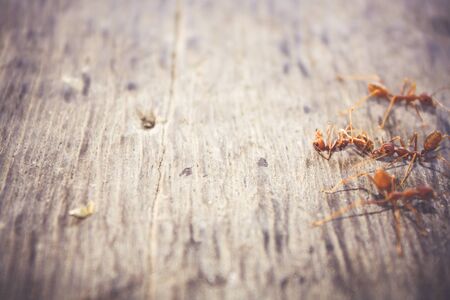 Vintage style, Ants are eating a died ant on wood floor background
