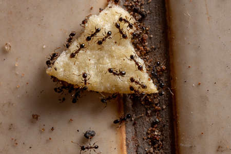 Closeup ants eating food waste