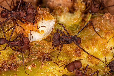 Adult Atta Leaf-cutter Ants of the Genus Atta eating leftover mamgaba fruit lying on the ground