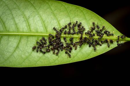Image of black ant group on the green leaves.