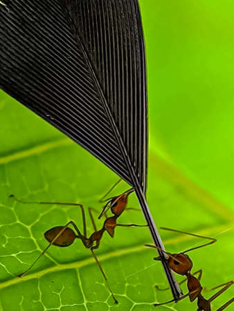 Red Ant bridge unity team. Close up Macro of Ant making unity bridge on plant with nature forest green background. Ant action standing.