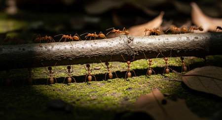 Ants working on a stick in the forest, teamwork concept.