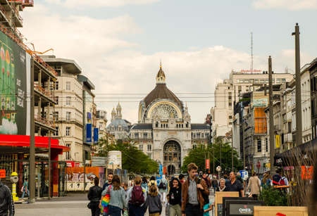Antwerp, Flanders, Belgium. August 2019. Old town: in the background the imposing railway station. The course leading to it is crowded with people who move chaotically.